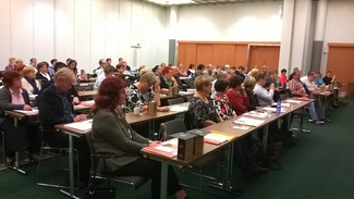 ![]() Etelä-Suomen alueen yhdistykset olivat hyvin edustettuina. Johtajistoa paikalla kiitettävästi. Eturivissä aluetoimiston toimitsojoita, etualalla aluetoimiston päällikkö Tuija Linna-Pirinen. |